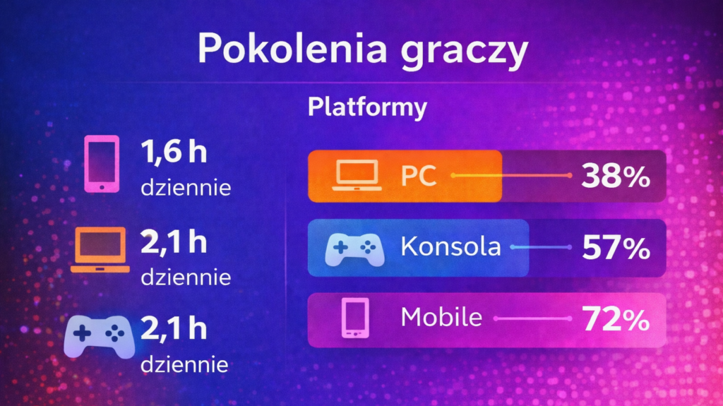 Z punktu widzenia nawyków grania kluczowe jest to, że dla wielu użytkowników gaming nie ma charakteru jednorazowej aktywności, lecz powtarzalnego elementu codzienności. Dane z raportu pokazują, że gracze spędzają na grach od około 1,5 do ponad 2 godzin dziennie, w zależności od wieku i stylu życia. Dla części użytkowników są to krótsze, częstsze sesje, inni wybierają dłuższe sesje w czasie wolnym, najczęściej wieczorem. Oznacza to, że sposób grania jest zróżnicowany i silnie powiązany z rytmem dnia, co bezpośrednio wpływa na potrzeby związane z wygodą i organizacją korzystania ze sprzętu.